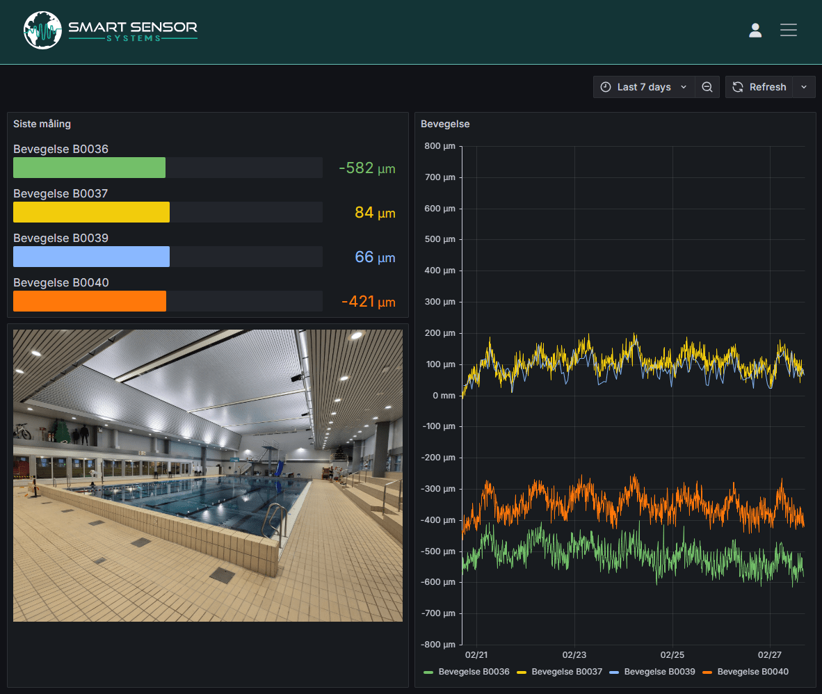 In the swimming pool in Mandal, Lindesnes Municipality wants to measure displacements in the roof due to wind and other loads. Here, Smart Sensor Systems has supplied four sensors and the iBridge smart sensor-based system, which has now been installed by the municipality itself.